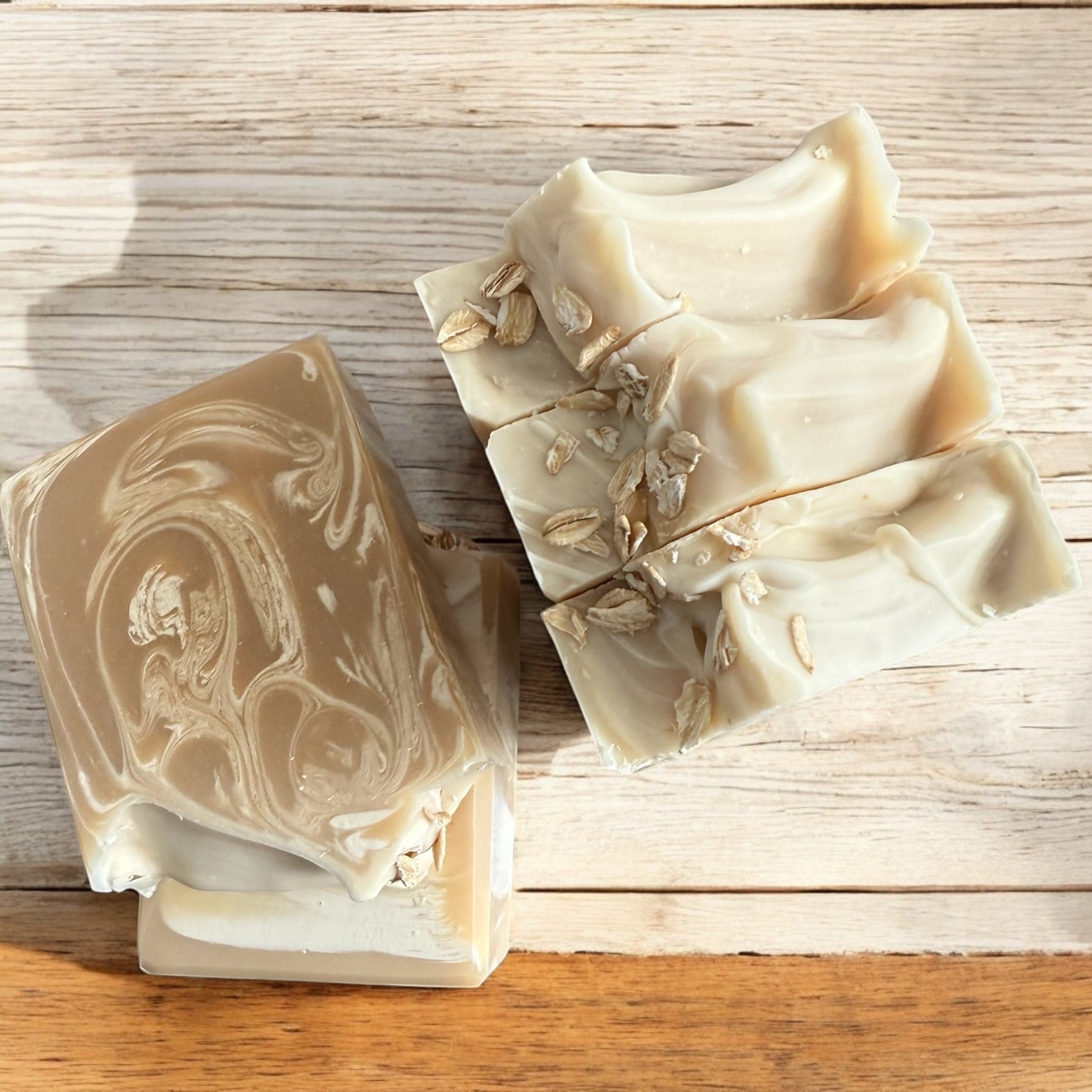 Oatmeal, Milk, and Honey artisan soap made with high-quality oils and butters like olive oil, coconut oil, cocoa butter, castor oil, shea butter, along with goat’s milk and honey, provides a range of nourishing benefits for the skin. Here's a breakdown of the benefits each ingredient offers: